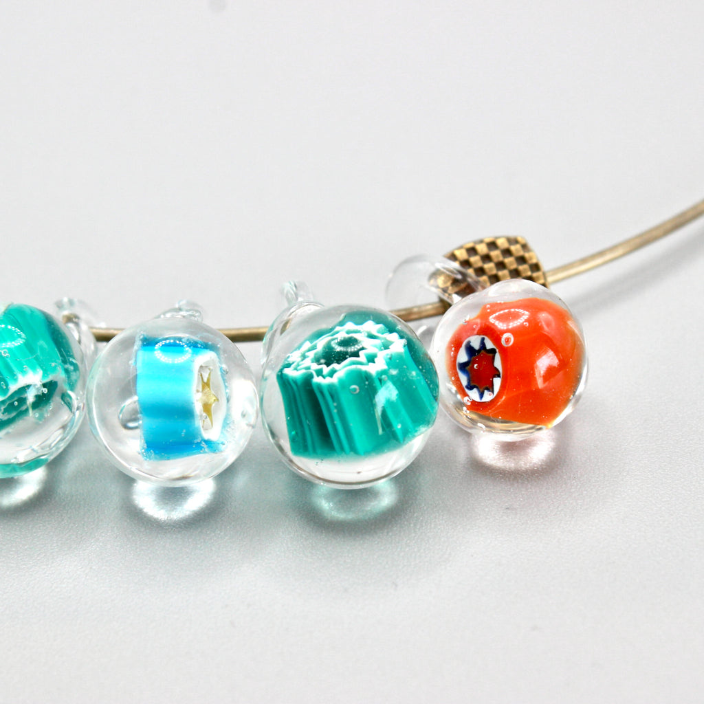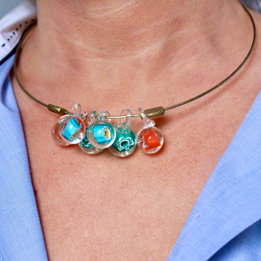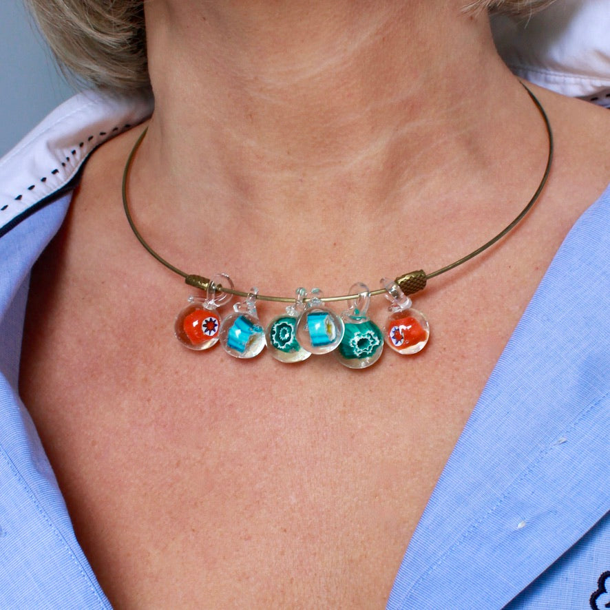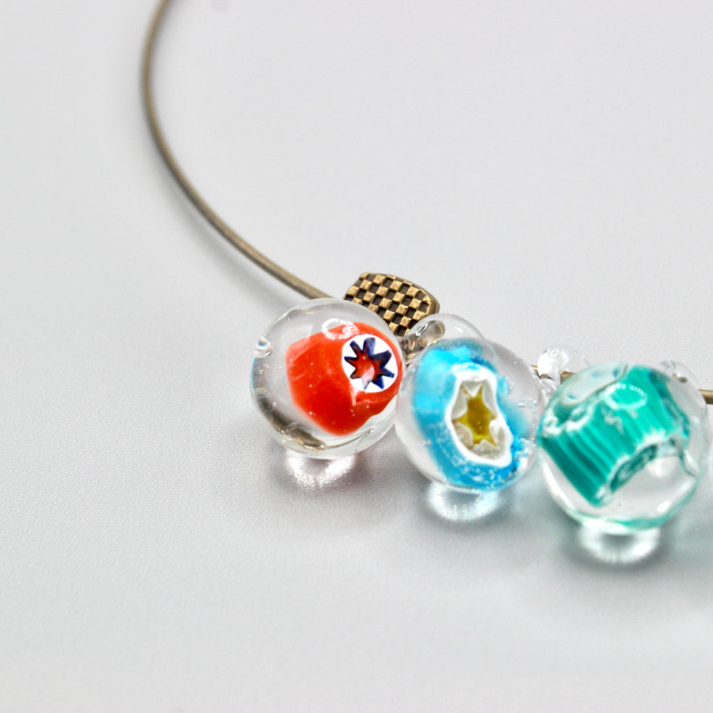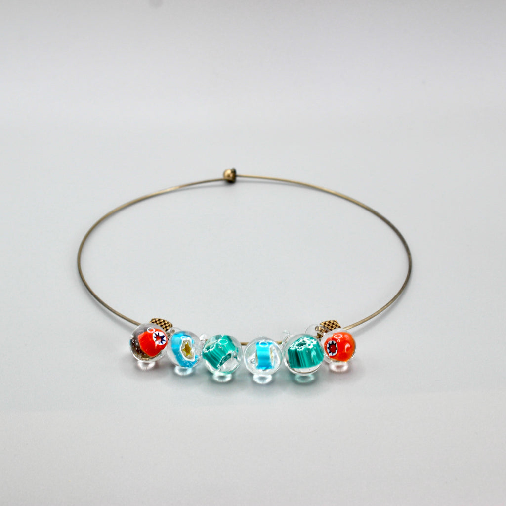 Ras de cou Murrines en verre de Murano filé au chalumeau par Pasc@l le perlier d'art maison montée sur un ras de cou rigide en métal qui s'adaptera parfaitement et facilement à tous les tours de cou, en un clin d’œil joyeux.