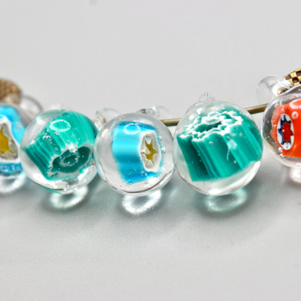 Perles murrines vénitiennes multicolores en vert (2), orange (2) et turquoise (2) enrobées de cristal transparent en verre de Murano maison filé à la flamme avec la bélière incluse (6)