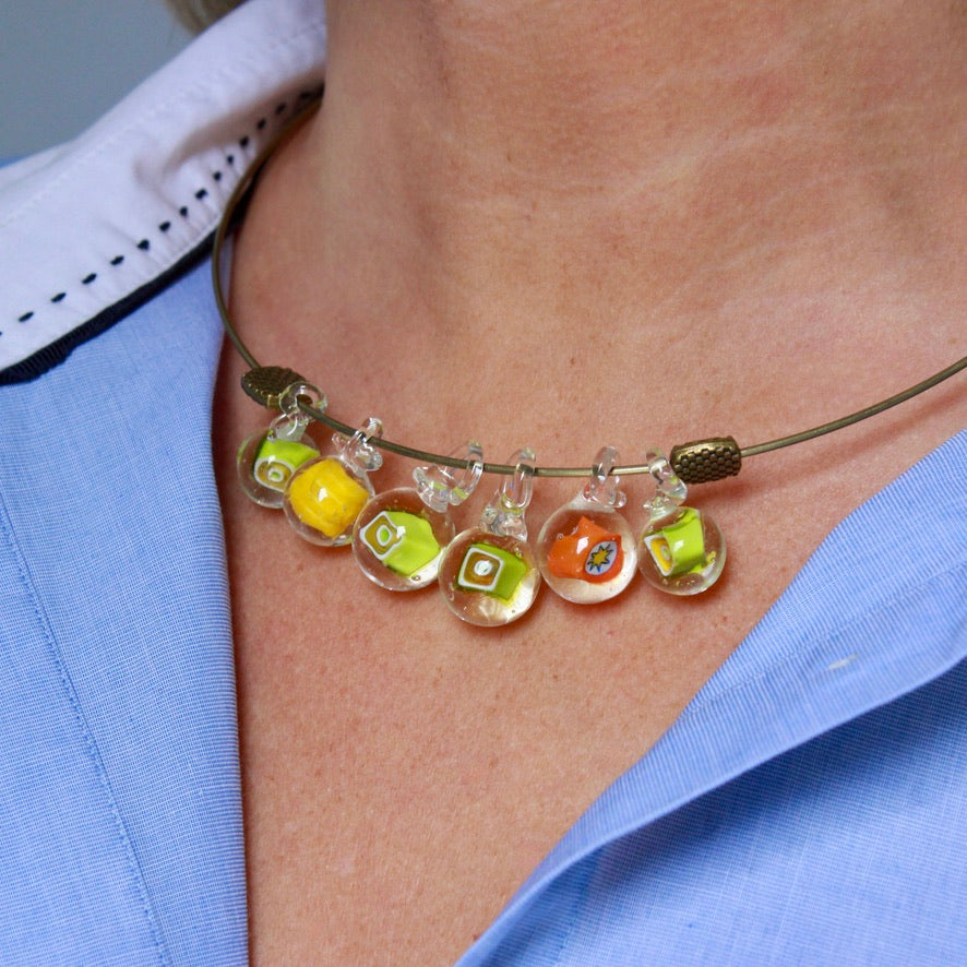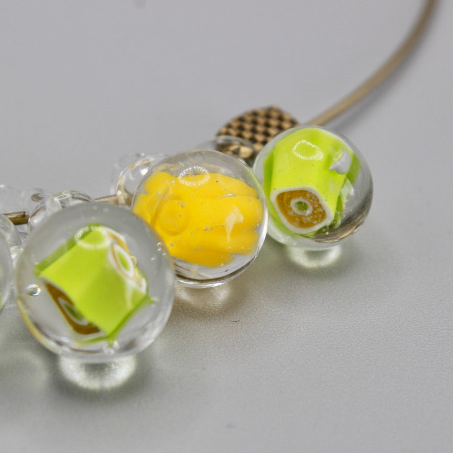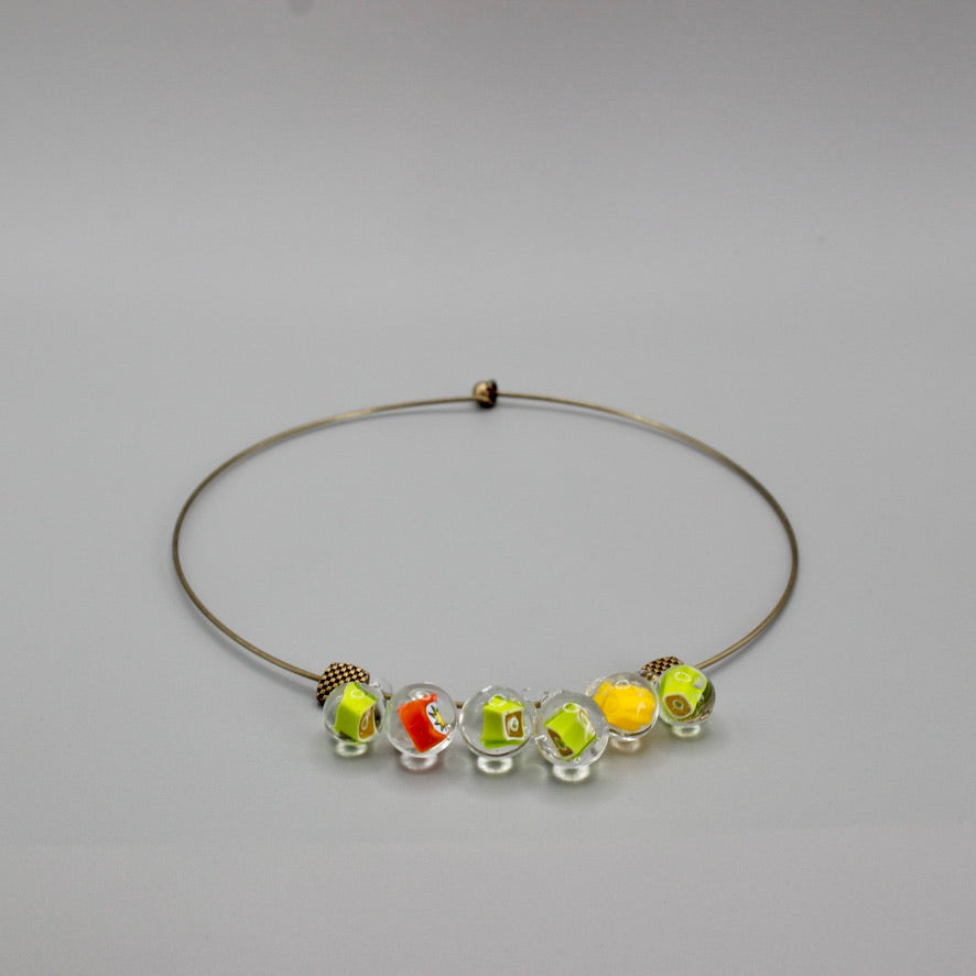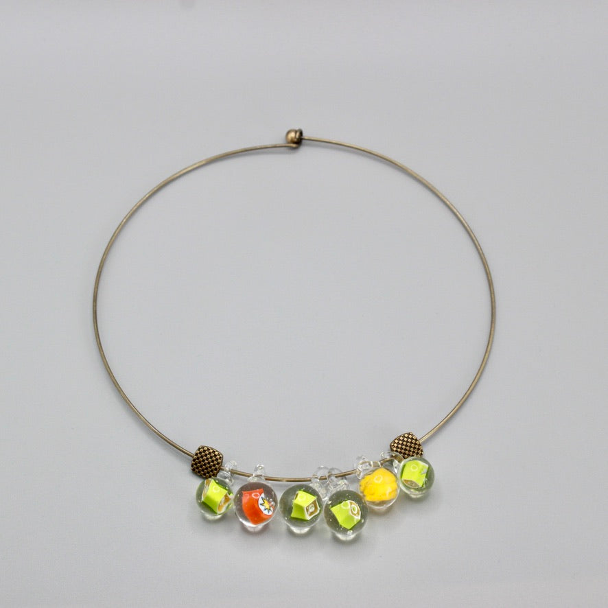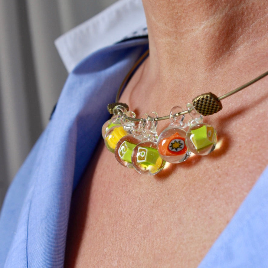 Ras de cou Murrines en verre de Murano filé au chalumeau par Pasc@l le perlier d'art maison montée sur un ras de cou rigide en métal qui s'adaptera parfaitement et facilement à tous les tours de cou, en un clin d’œil joyeux.