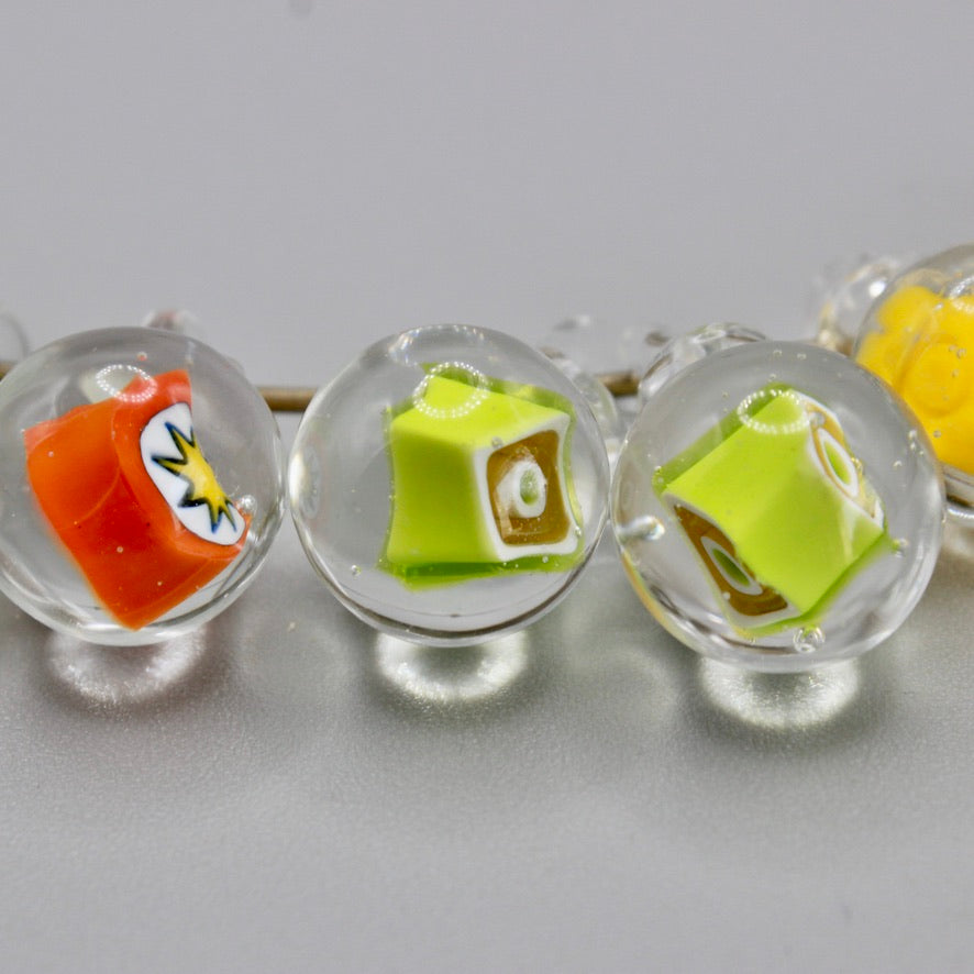 Perles murrines vénitiennes multicolores en vert anis, orange et jaune soleilenrobées de cristal transparent en verre de Murano maison filé à la flamme avec la bélière incluse (6)
