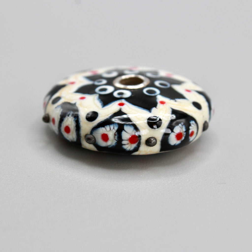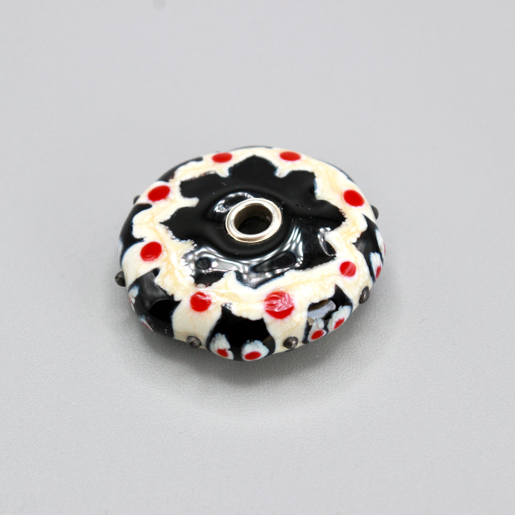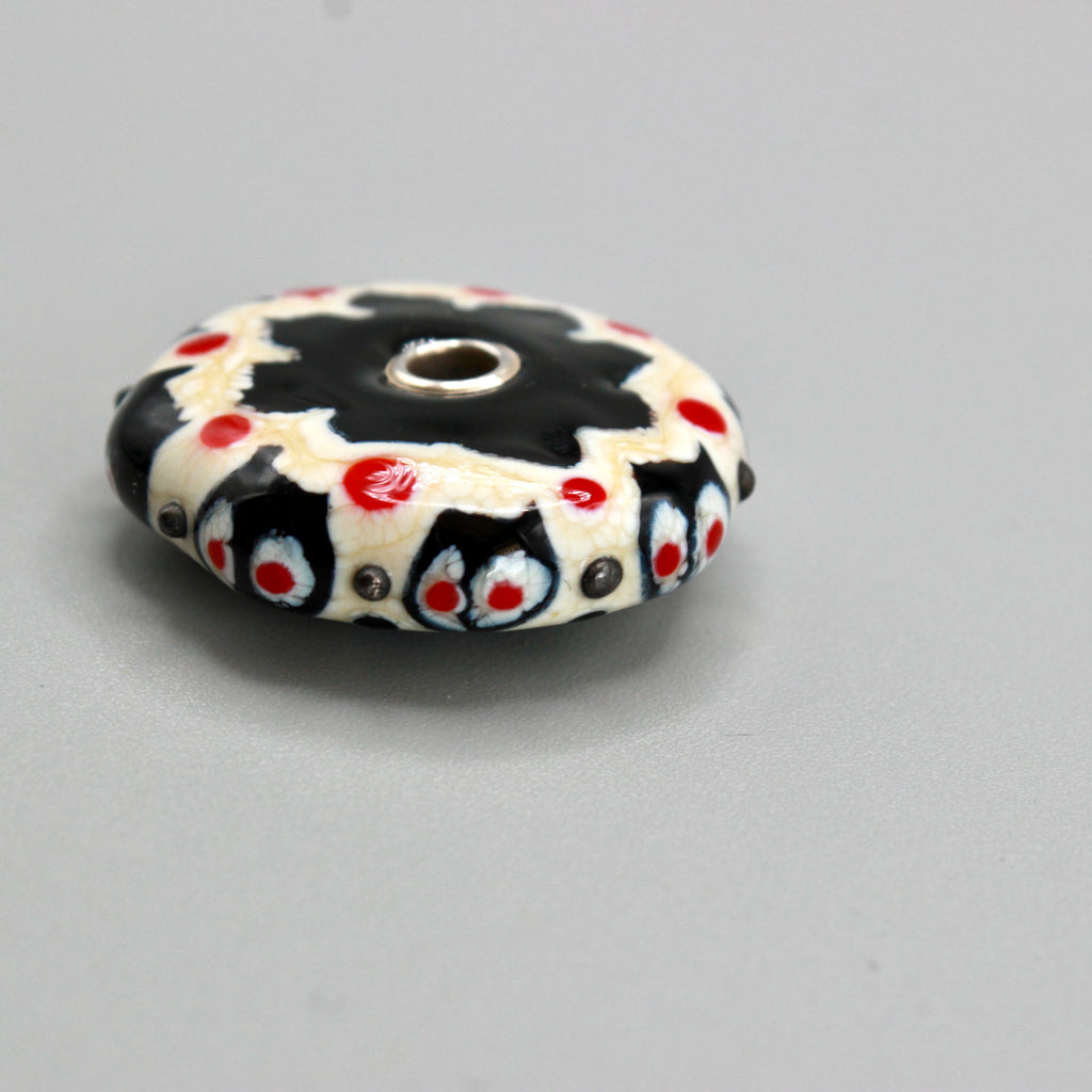 Pendentif forme lentille noir et blanc ivoire saupoudrée d'une touche subtile de rouge plat ou en picots sur la tranche et trouée en son centre rehaussé par deux œillets en argent 925  pour une perle en verre de Murano ronde un peu, beaucoup, passionnément maison filé au chalumeau aux couleurs multicolores et chatoyantes