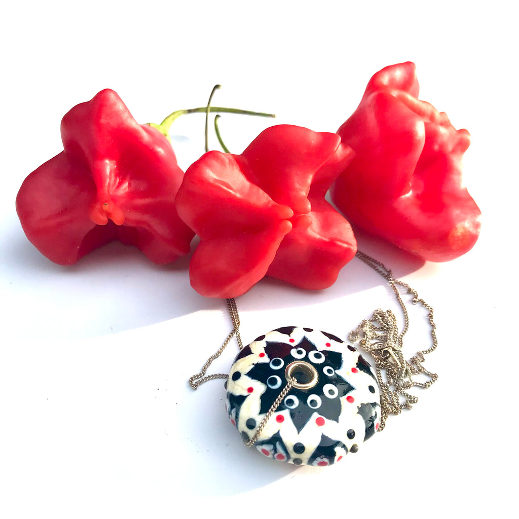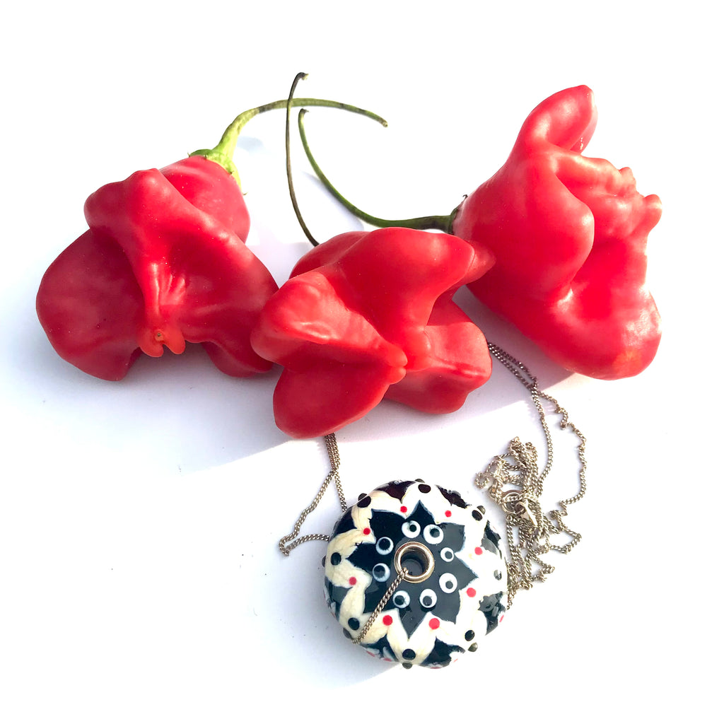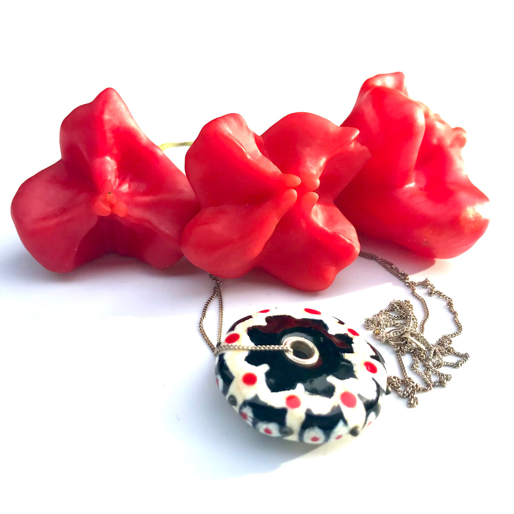 Pendentif forme lentille noir et blanc ivoire saupoudrée d'une touche subtile de rouge plat ou en picots sur la tranche et trouée en son centre rehaussé par deux œillets en argent 925  pour une perle en verre de Murano ronde un peu, beaucoup, passionnément maison filé au chalumeau aux couleurs multicolores et chatoyantes