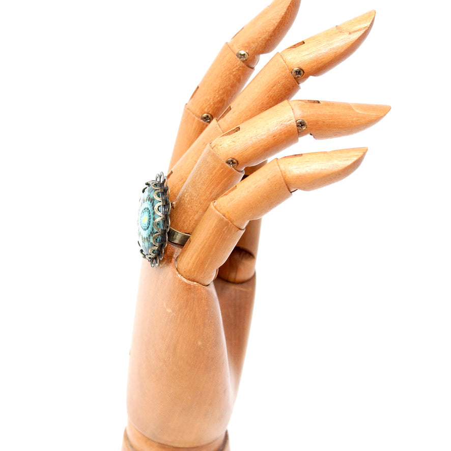 Bague ronde cabochon bombé en résine au motif d'un mandala bleu