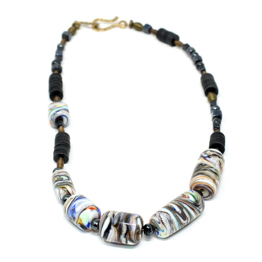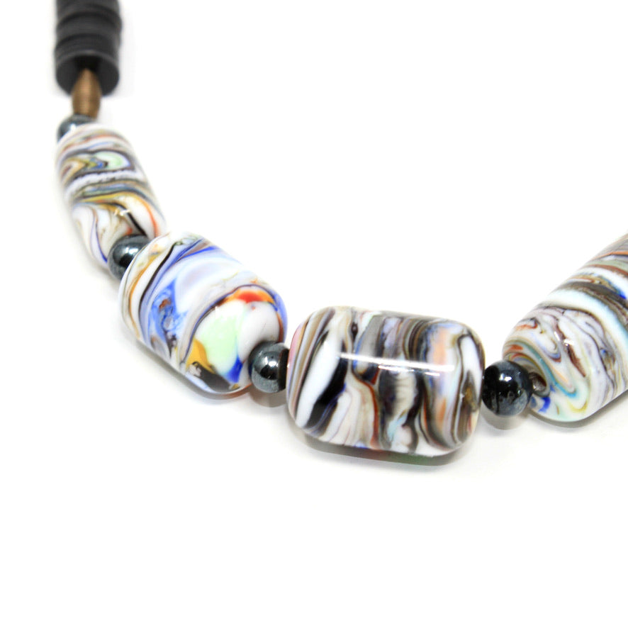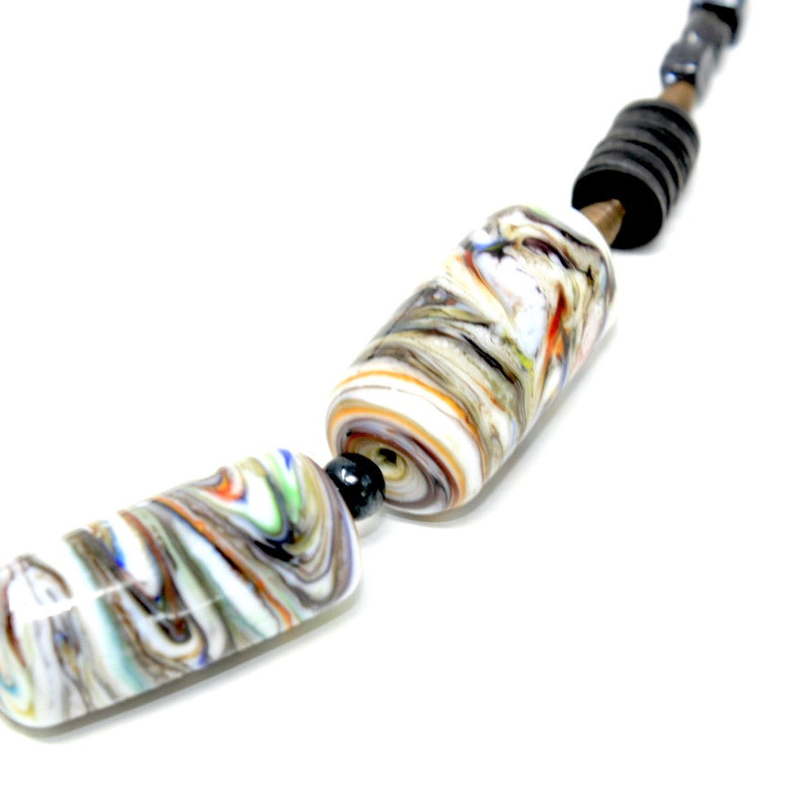 Collier asymétrique Perles Heishis Abélia TentaPerles artisanales tibes à motifs graphiques abstraits nuances mélangés maritimes en verre de Murano filé au chalumeau maison (6) de tailles et formats différents