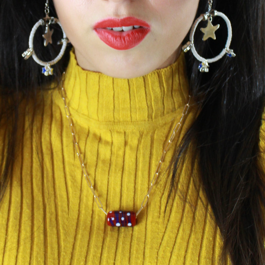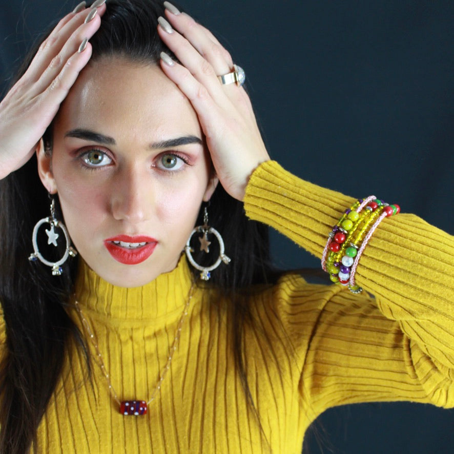 Créoles pendantes en métal argenté composées de Heishis ou rondelles en Vinyle du Ghana de deux tailles associés à sept breloques perles étoiles Star