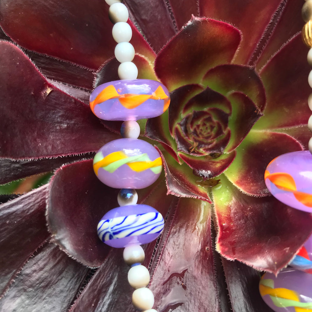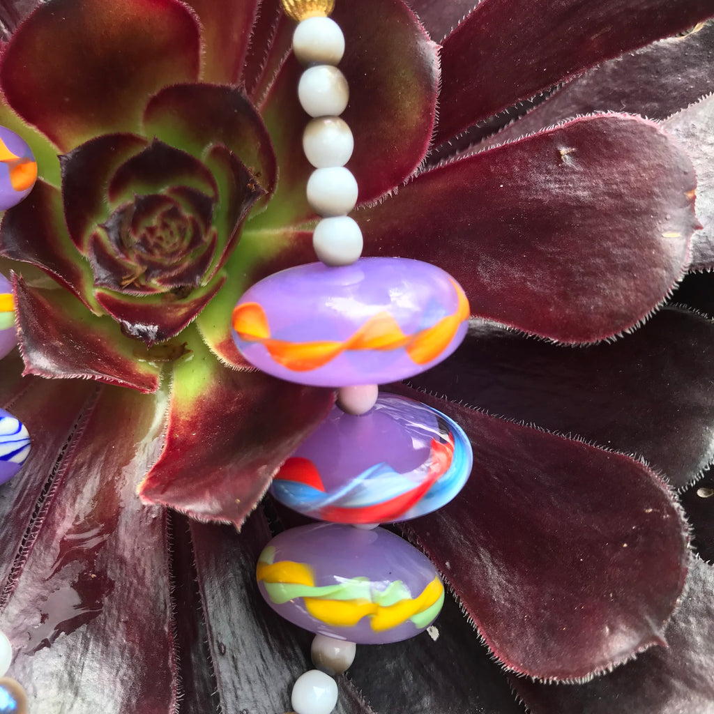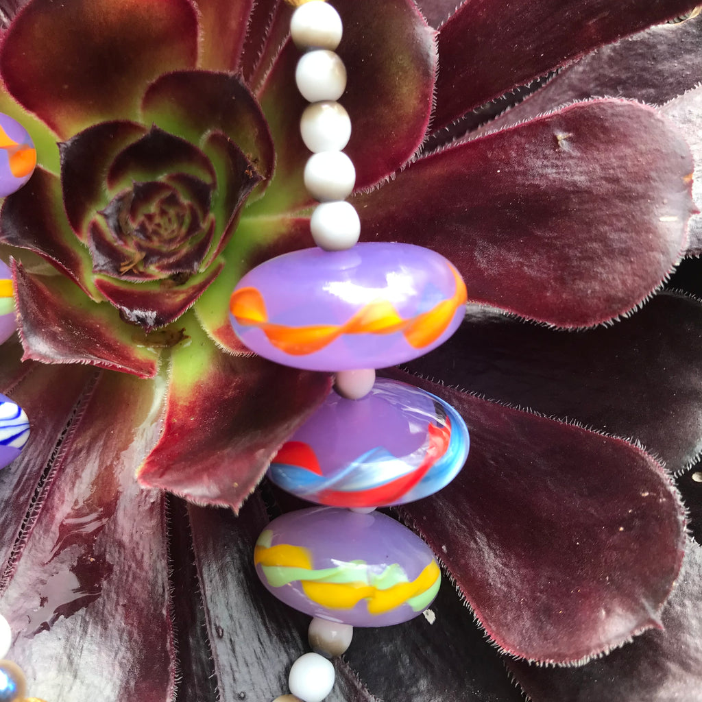 Perles disques et rondes de tailles différentes et de couleur mauve avec un décor graphique multicolore en verre de Murano filé au chalumeau maison (6)