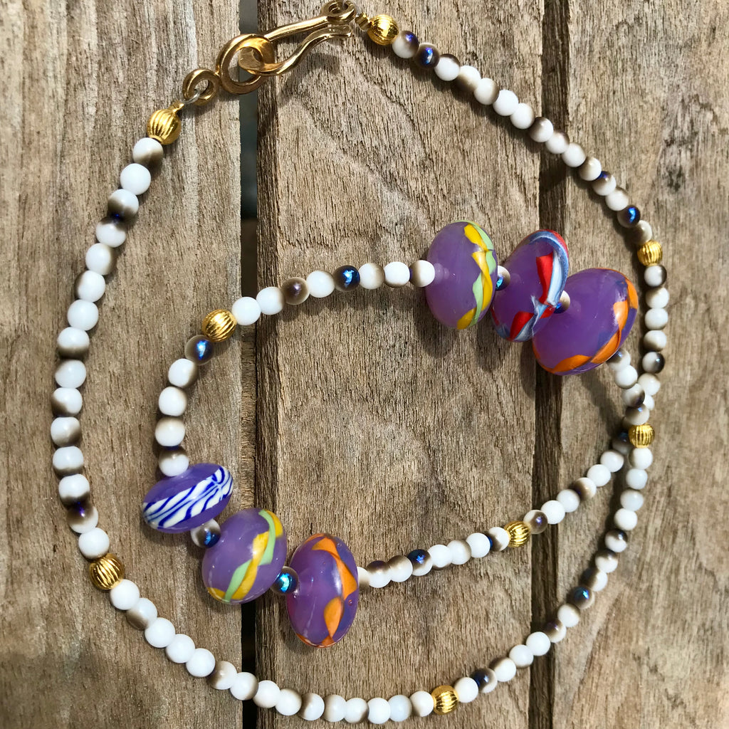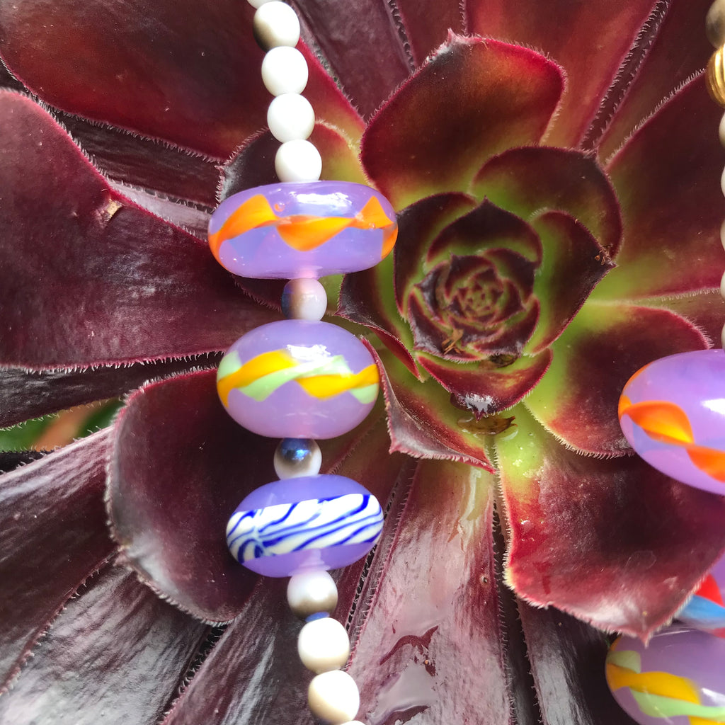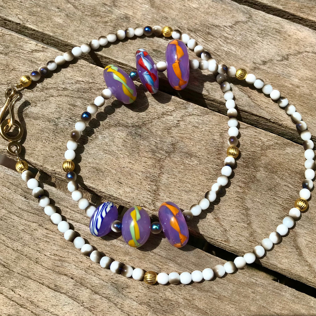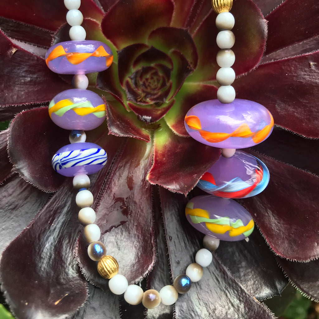 Perles disques et rondes de tailles différentes et de couleur mauve avec un décor graphique multicolore en verre de Murano filé au chalumeau maison (6)
