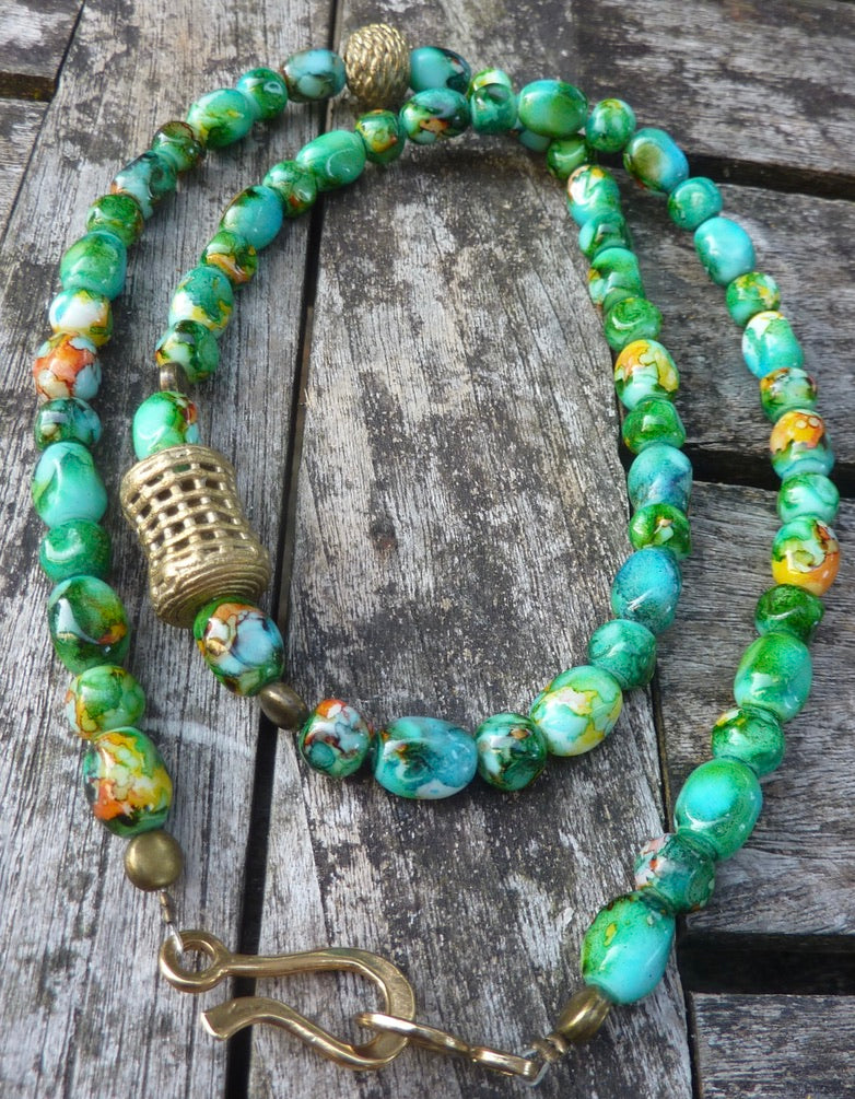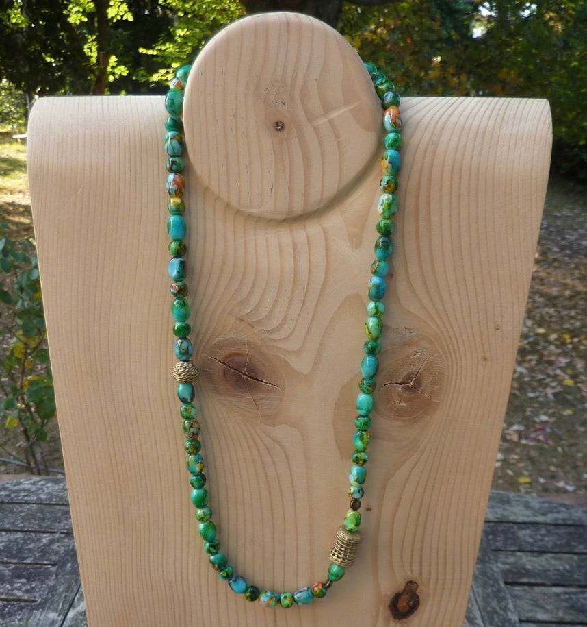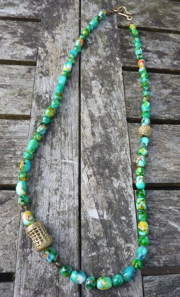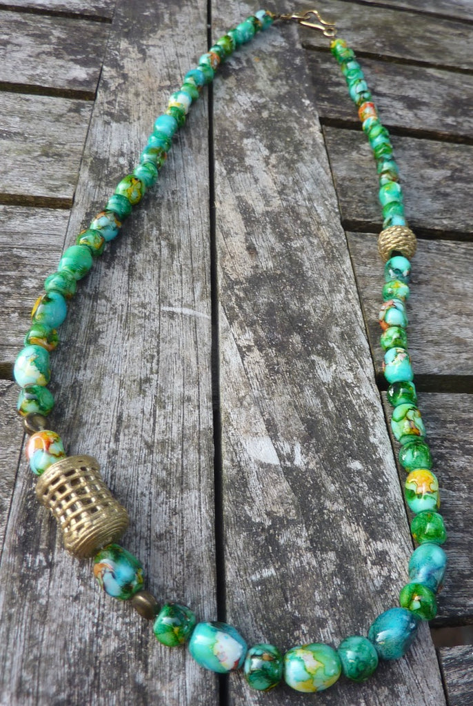Perles olives et rondes marbrées vertes en verre artisanales