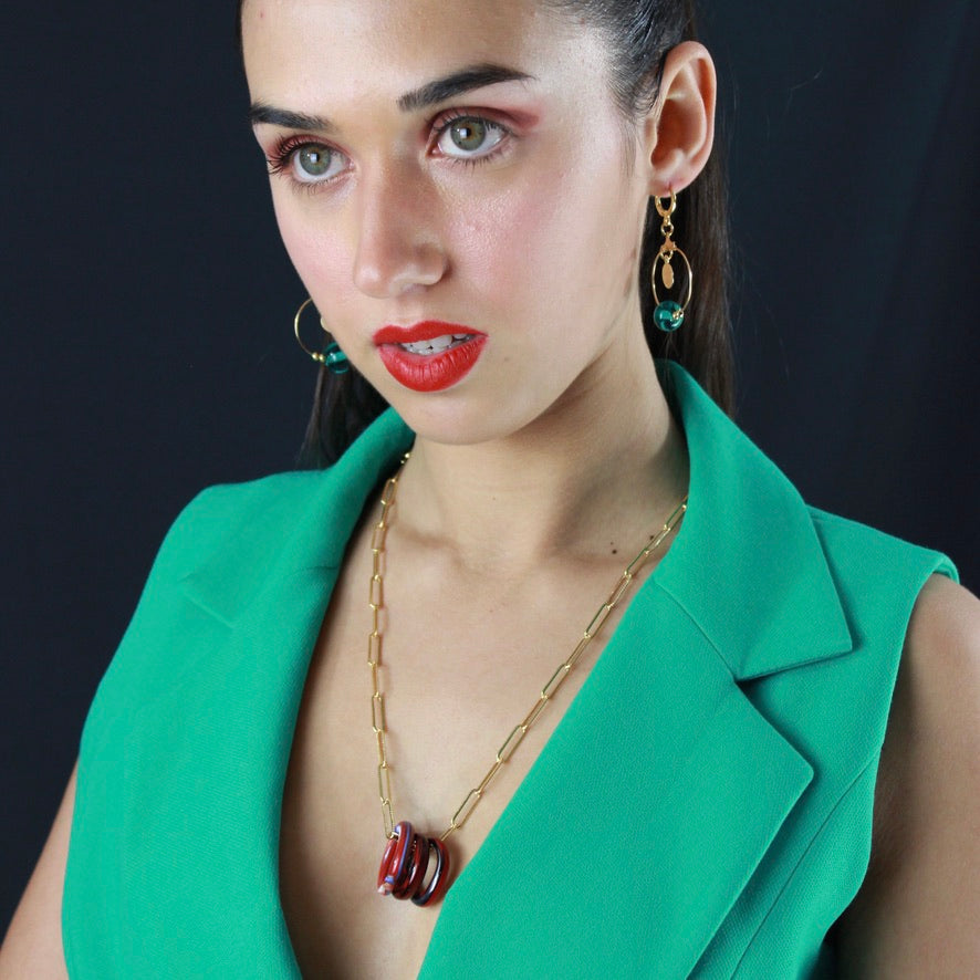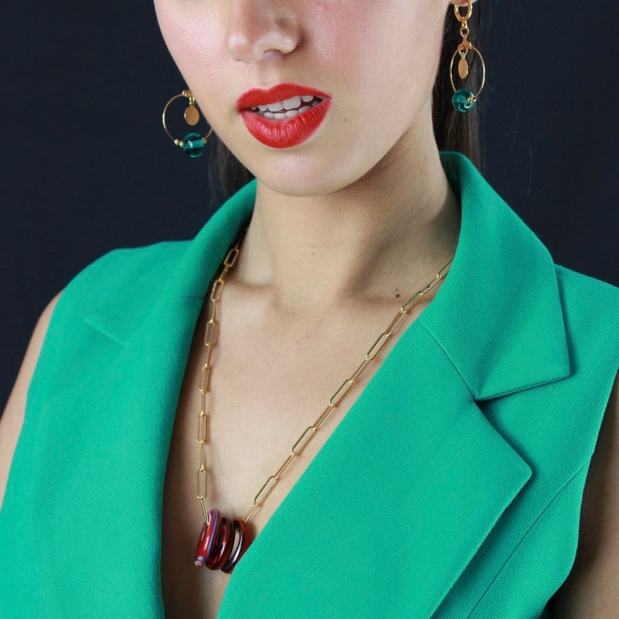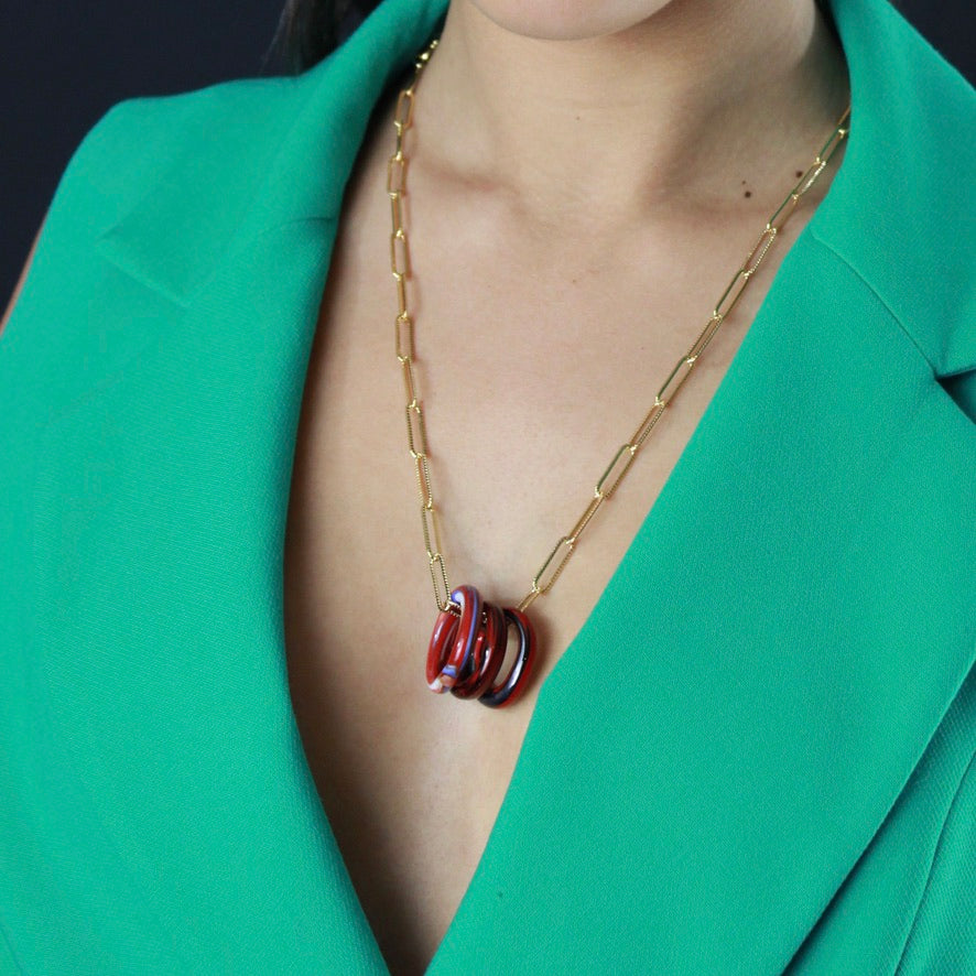 Pour une histoire à vous inventer autour d'un trio d'anneaux en Murano aux couleurs rouge passion d'un voyage lointain à imaginer de porter autour de votre cou pour le vivre en pleine harmonie