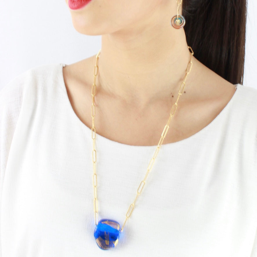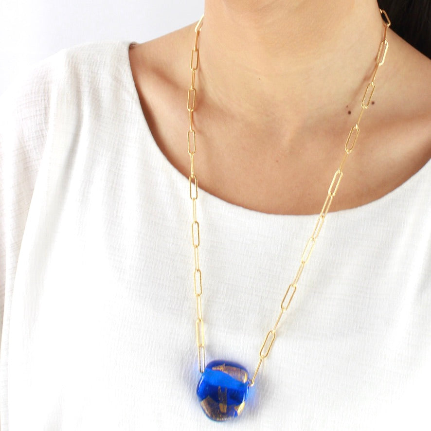 Perle centrale goutte cube tout en transparente pour un cristal Murano travaillé avec finesse et élégance dans une couleur turquoise rehaussée à la feuille d'or dans une forme renouvelée pour une pendentif d'exception, véritable talisman personnel en verre de Murano filé au chalumeau maison