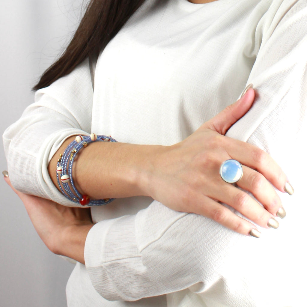 Bracelet à mémoire de forme pour un effet manchette aux couleurs de l'azur composé de 6 rangs multicolores de perles en verre de rocailles bleu ciel et perles breloques en métal doré, le tout mélangé pour démultiplier les reflets rayonnants sur votre poignet.