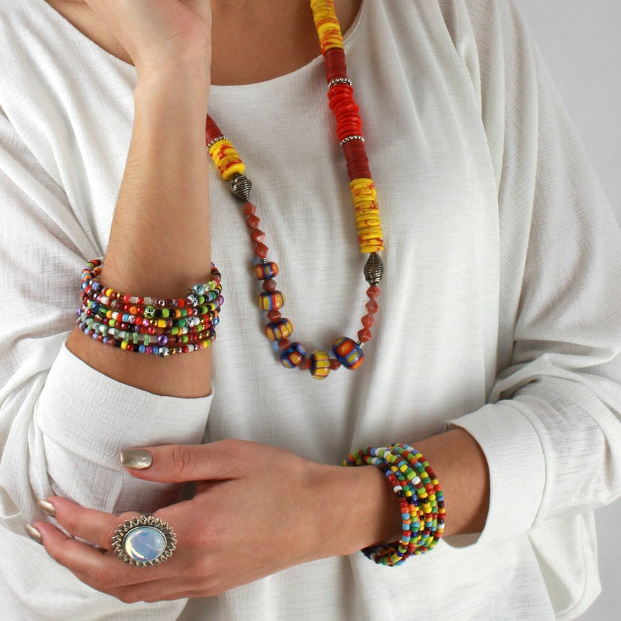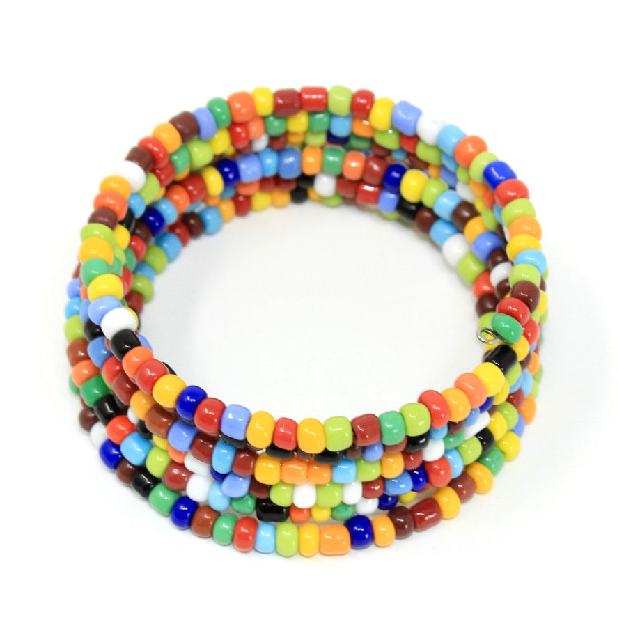 Bracelet à mémoire de forme pour un effet manchette composé de 7 rangs de perles disques en verre multicolore pour démultiplier les reflets rayonnants sur votre poignet.