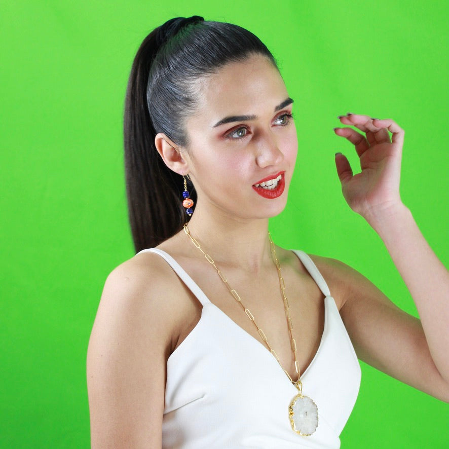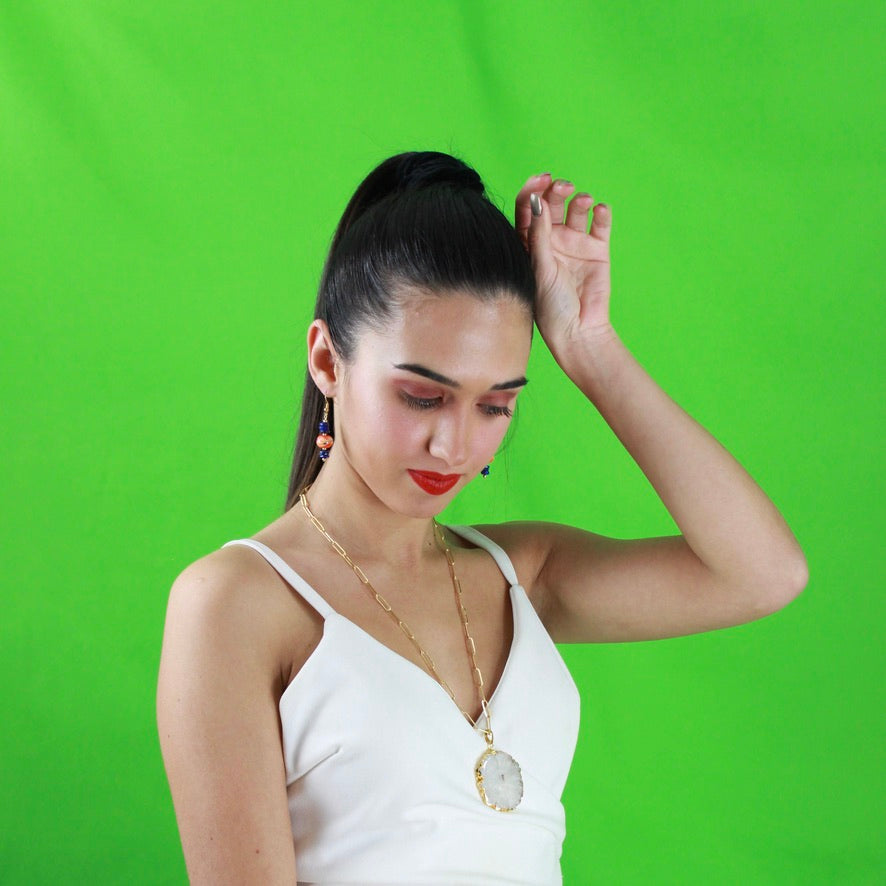 Ce pendentif alliant élégance et finesse est une tranche de cristal de roche avec un côté polissage avec une projection d or sur une base de laiton qui couvre son périmètre.