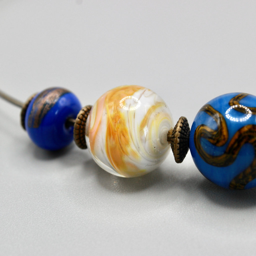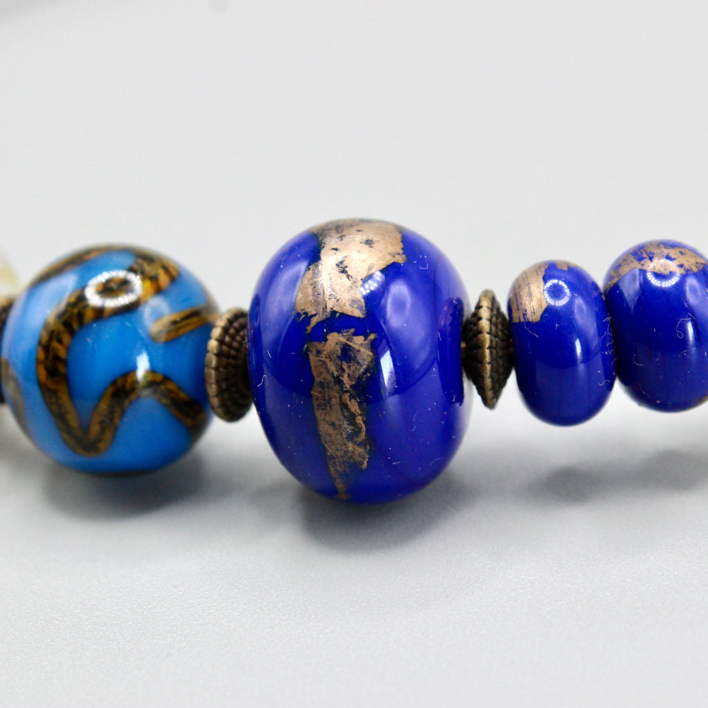 Perles bleues rehaussées d'une feuille d'argent en verre de Murano filé au chalumeau maison (5) de deux tailles différentes