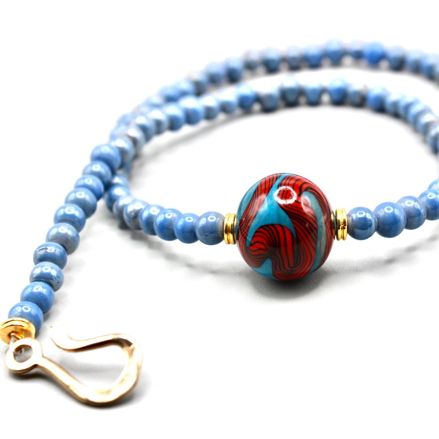 Perle ronde centrale Volupta de couleur bleu jean lagon décorée d'une volute noire et rouge en verre de Murano filé au chalumeau maison (1)
