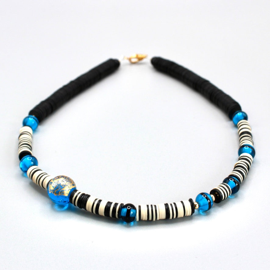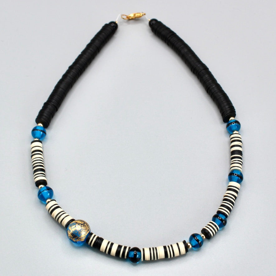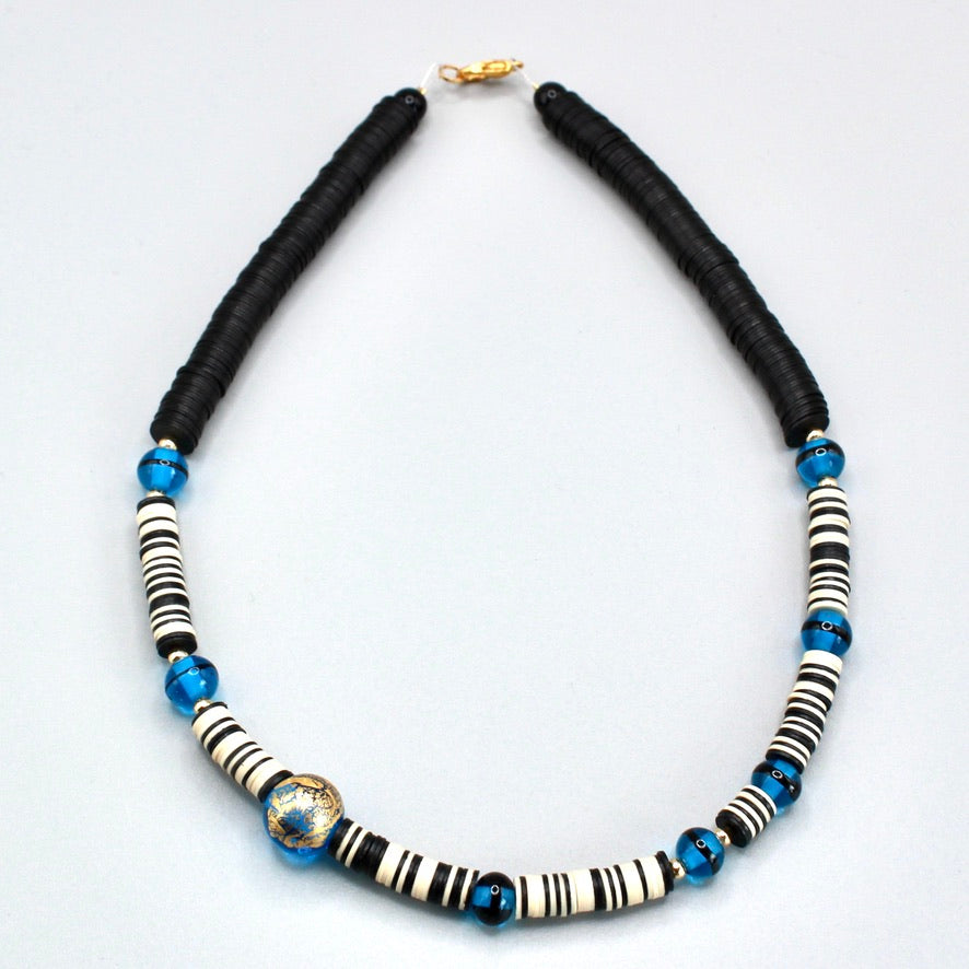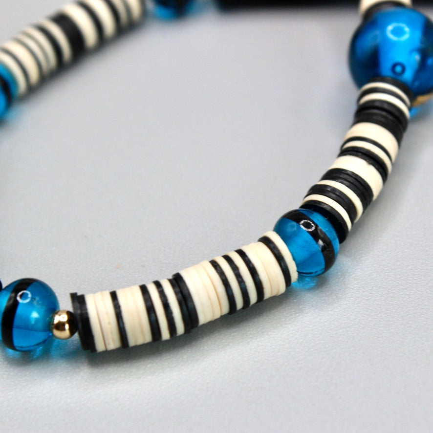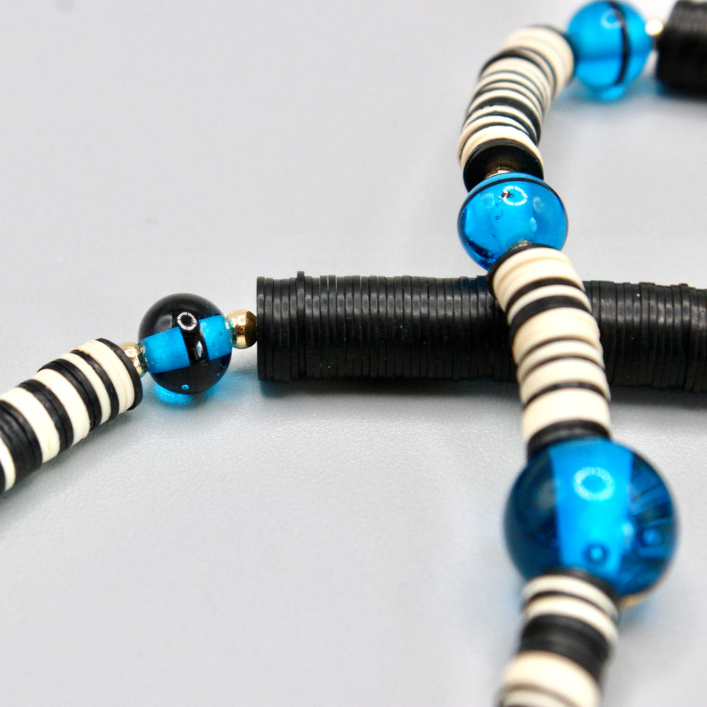 Perles artisanales africaines heishis du Ghana en vinyle bleue, noire et blanche