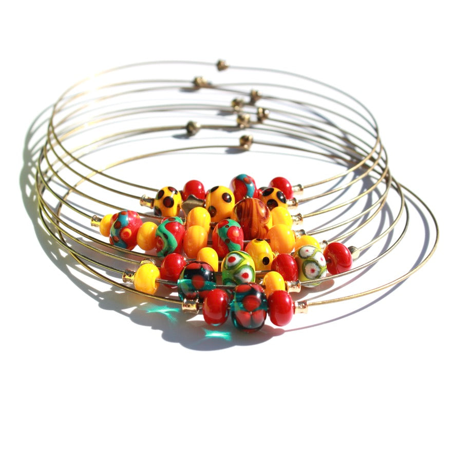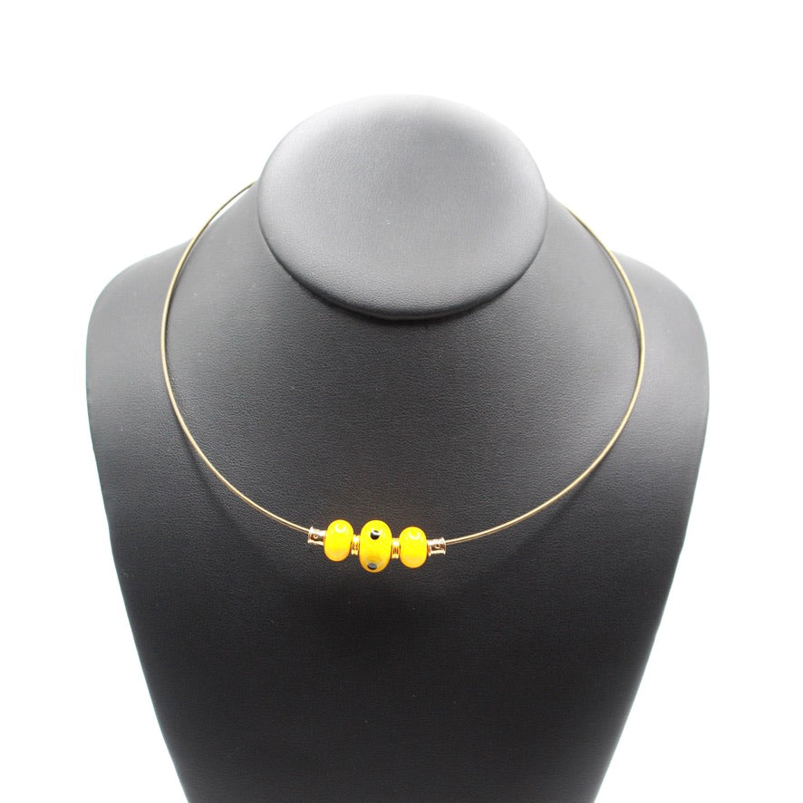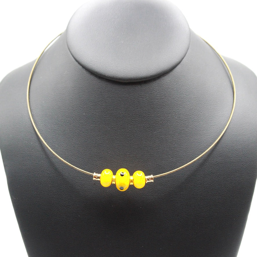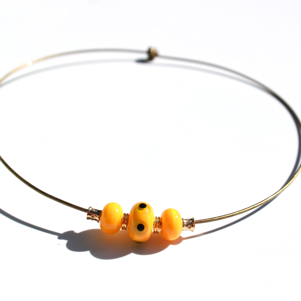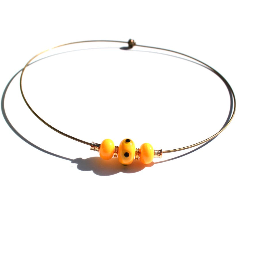 Collier en verre de Murano filé au chalumeau par Pasc@l le perlier d'art maison d'un un ras de cou semi-rigide en métal qui s'adaptera parfaitement et facilement à tous les tours de cou, en un clin d’œil joyeux.