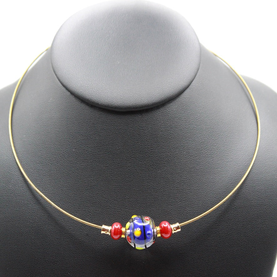 Collier en verre de Murano filé au chalumeau par Pasc@l le perlier d'art maison d'un un ras de cou semi-rigide en métal qui s'adaptera parfaitement et facilement à tous les tours de cou, en un clin d’œil joyeux.